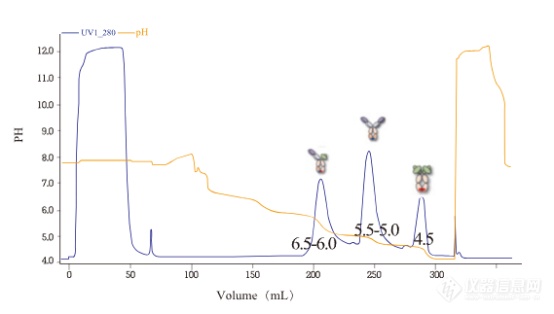 上一篇关于聚集体去除的文章所述,聚集体和片段因含有Fc结构域,可与Protein A特异性结合,其结合-洗脱特性与方针双抗分子类似。鉴于不同分子与Protein A的结合强度存在必定的差异,可经过优化洗脱pH条件,挑选性去除结合较弱的片段[2]。以UniMab 50HC亲和层析纯化某双抗为例(图3):在pH 5.5条件下,半抗及片段被洗脱;而在pH 5.0和pH 4.5条件下,别离洗脱下完好双抗和双抗聚集体。